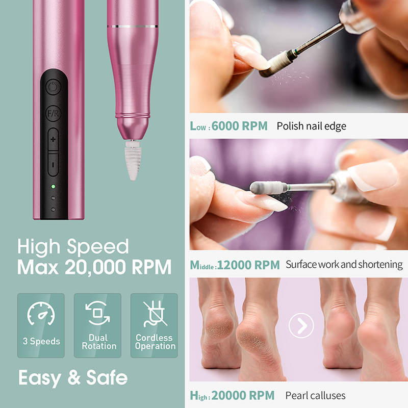Les limes à ongles professionnelles sont conçues avec 3 vitesses de 6000-12000-20000, appuyez simplement brièvement sur le bouton + ou - pour augmenter ou diminuer la vitesse. Facile à régler la vitesse et gagner du temps lors de l'affûtage des ongles. La direction de la perceuse peut être facilement modifiée en appuyant sur le bouton F/R, idéal pour les gauchers, les maîtres des ongles ou les débutants en soins des ongles.
