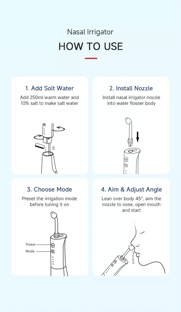 Portabilité : Bien que les irrigateurs nasaux électriques puissent nécessiter un accès à l’électricité ou à des piles, de nombreux modèles sont conçus pour être compacts et portables, ce qui les rend adaptés à une utilisation à la maison ou en voyage.