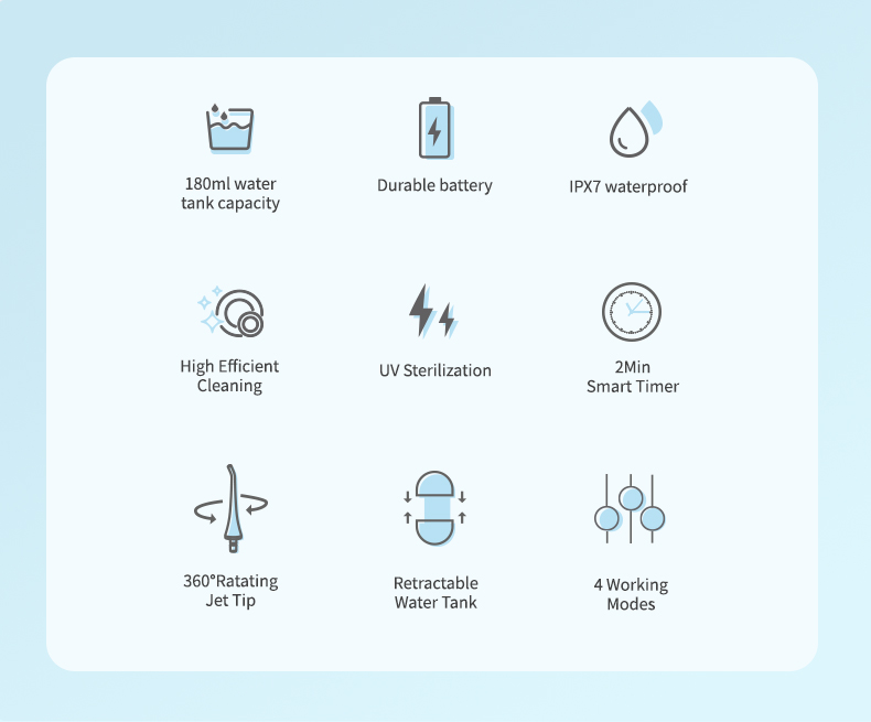 Ce cure-dent pour hydropulseur délivre des impulsions d'eau à haute pression à 1400-1800 fois par minute, éliminant efficacement 99,9 % de la plaque dentaire pour un nettoyage en profondeur des dents. Ce cure-dent pour hydropulseur masse les gencives, favorise la circulation sanguine et traite les problèmes bucco-dentaires comme la mauvaise haleine et les dents orthodontiques