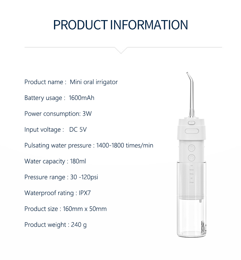Nettoyage en profondeur avec une forte pression : l'hydropulseur adopte la dernière technique d'impulsion pour offrir 4 modes avec une plage de pression entre 30 et 90 psi et une fréquence d'impulsion de 1400 à 1800 fois/minute, pour offrir une eau de haute intensité qui nettoie 99,99 % des tensions dentaires, spécialement conçue pour la parodontite, les appareils orthodontiques.