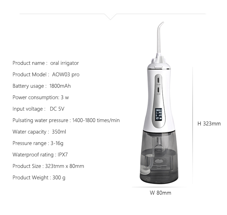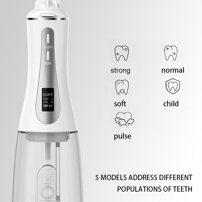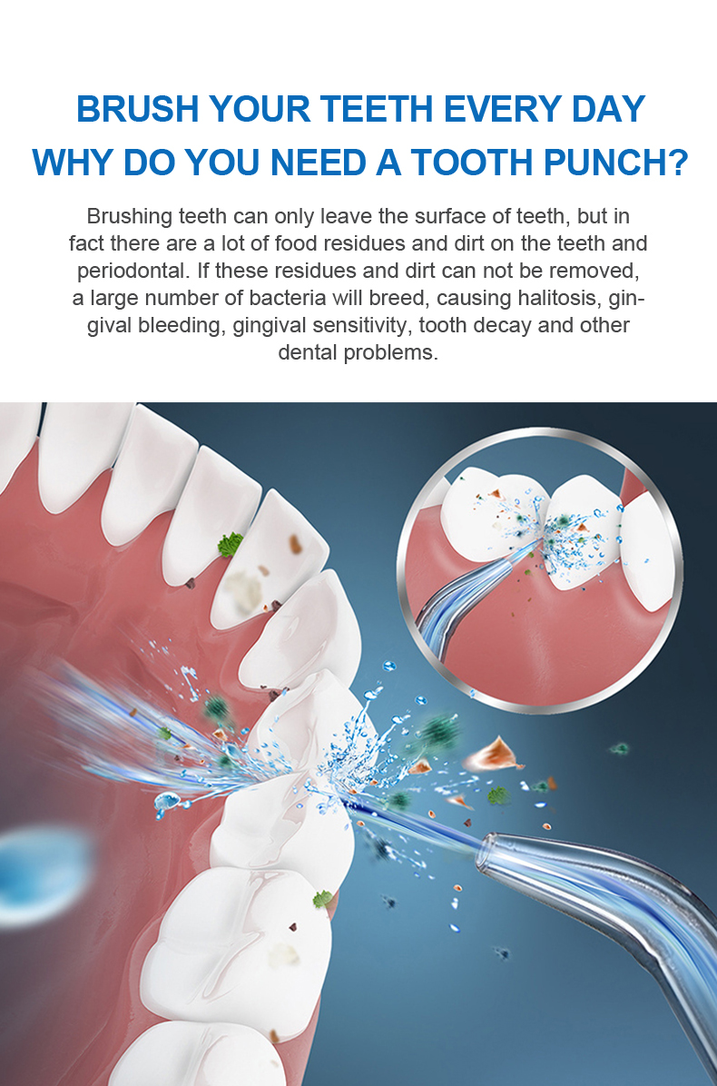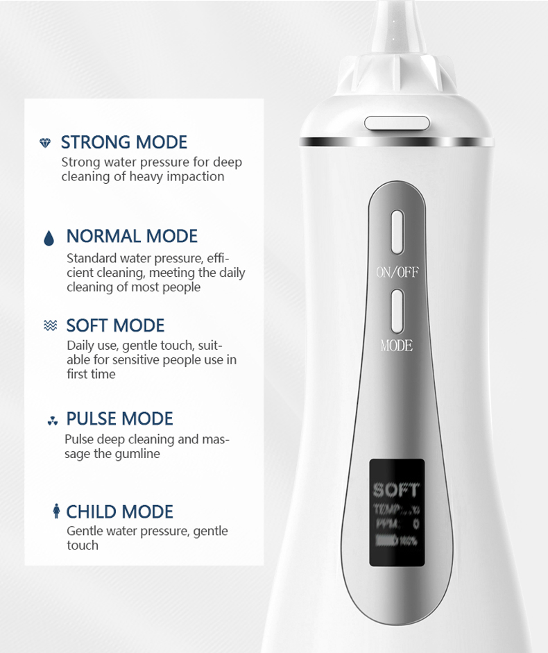 Ce cure-dents à eau délivre des impulsions à haute pression d'eau à 1 400-1 800 fois par minute, éliminant efficacement 99,9 % de la plaque dentaire pour un nettoyage en profondeur des dents. Ce cure-dents à eau masse les gencives, favorise la circulation sanguine et résout les problèmes bucco-dentaires comme la mauvaise haleine et les dents orthodontiques.