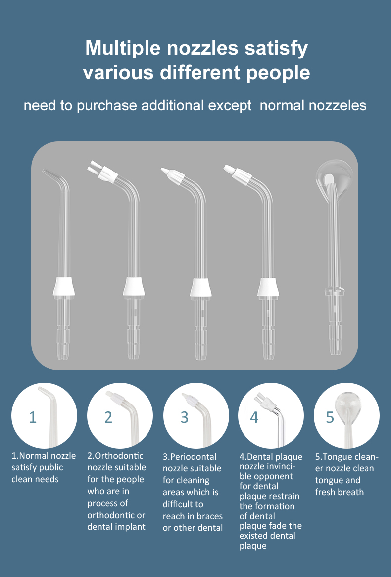 Évalué professionnellement par une équipe dentaire américaine, notre fil dentaire propose cinq modes pratiques pour répondre aux différents besoins de 99 % des groupes d'âge différents, tout en garantissant des performances et une durée de vie optimales. Sa poignée ergonomique et ses 6 buses interchangeables assurent une expérience confortable et polyvalente. C'est un cadeau attentionné pour les anniversaires, Noël, Thanksgiving, la Saint-Valentin, la fête des mères ou pour prendre soin de la santé bucco-dentaire de vos proches.