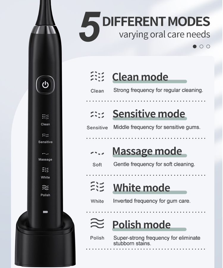 - 5 MODES DE BROSSAGE HAUTE PERFORMANCE - Propre (doux), Blanc (fort), Polissage (fréquence inversée forte), Plus doux (fréquence inversée douce) et Sensible (doux) pour s'adapter à différentes conditions de dents et de gencives, vous pouvez donc choisir différents modes en fonction de vos préférences et des recommandations du dentiste.